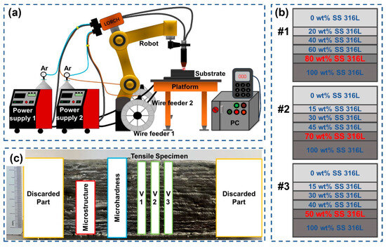 A D-WAAM system was chosen as the experimental platform, comprising two power supplies (LORCH S5-Robot MIG), two automatic wire feeders, a FANUC welding robot (M-10iA), a robot control cabinet and two shielding gas systems (Ar, 99.99% purity) (see Figure 1a). A gradient transition from SS 316L to Inconel 625 was realized by modulating the wire feed speeds of both welding wires. It was observed that the compositional gradient was correlated with the wire feed rate and density of the welding wire. Consequently, the design for the compositional gradient of the SS 316L/Inconel 625 FGMs can be summarized in the expression below: