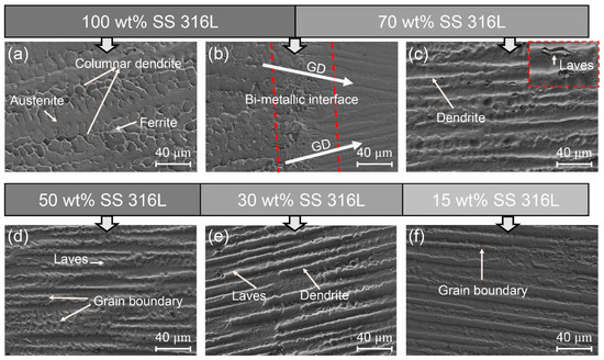 The SEM morphology of specimen #2: (a) 100 wt.% SS 316L; (b) bi-metallic interface of 100 wt.% SS 316L and 70 wt.% SS 316L; (c) 70 wt.% SS 316L; (d) 45 wt.% SS 316L; (e) 30 wt.% SS 316L; and (f) 15 wt.% SS 316L.