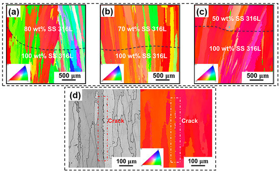 In order to further study the microstructural evolution of FGMs, EBSD analysis was employed in this study. The grain structure of FGMs typically exhibits dendritic or cellular crystal formations, with predominant growth along the building direction. Figure 5 illustrates the Y0 inverse pole figure (IPF) maps of cross sections at the bi-metallic interface, focusing on the 100 wt.% SS 316L region and the first transition region for specimens 1, 2 and 3. A strong <001> texture aligned with the building direction is observed across all specimens due to the predominant heat dissipation occurring through conduction to the substrate [20]. In addition, the EBSD results reveal a consistent epitaxial grain growth at the bi-metallic interface across varying compositional regions, owing to the shared crystal structure (FCC) and chemical composition of SS 316L and Inconel 625 alloy [29]. Within the 100 wt.% SS 316L region, the granular grains can be observed at the grain boundaries, representing ferrite phases. Notably, with the addition of Inconel 625, the ferrite phase dissolves. Figure 5d presents the IPF figure of cracks in the 80 wt.% SS 316L/20 wt.% Inconel 625 region of specimen #1, revealing crack initiation at grain boundaries with disparate orientations [5]. Previous research has indicated that the addition of Inconel 625 leads to ferrite dissolution; the solubility of C element in the austenite phase decreases and the precipitation of MC phase increases, consequently predisposing the material to crack formation [21].