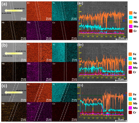 Elemental distributions of surface and line distribution maps at the bi-metallic interface from the 100 wt.% SS 316L zone to the first transition gradient region under different compositional gradients: (a,a1) specimen #1, (b,b1) specimen #2 and (c,c1) specimen #3.