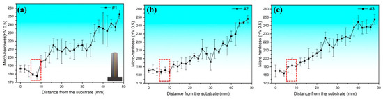 Microhardness distributions along the deposition direction under different compositional gradients: (a) specimen #1, (b) specimen #2 and (c) specimen #3.