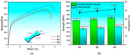 (a) Stress–strain curves and (b) tensile strengths of specimens under different compositional gradients.