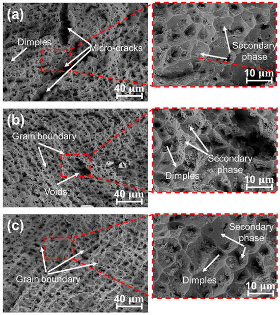 The fracture morphologies of specimens #1, #2 and #3 are shown in Figure 9, featuring ductile dimples of assorted dimensions, which are typical of a ductile fracture through micro-void coalescence. Figure 9a illustrates the fracture of specimen #1, revealing the presence of micro-cracks that significantly impact tensile strength. In addition, a small amount of the second phase is detected within the depths of the dimple. In Figure 9b, the fracture morphology of specimen #2, exhibits a dendritic structure. Compared to specimen #1, the ductile dimples of specimen #2 appear finer and denser, with no observed cracks, which endows specimen #2 with better tensile properties. Figure 9c displays the fracture morphology of specimen #3, characterized by a prominent dendritic texture, devoid of defects (such as cracks, pores and so on). The dimples, indicative of toughness, become finer, denser and deeper, thereby enhancing the tensile performance.