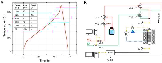 (A) Sintering profile for SiO2 samples; (B) setup for CO2 adsorption measurements.