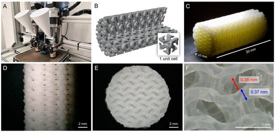 All parts were printed on a granulate-fed MEX printer, which was designed and constructed at ZHAW (Figure 2A). A cylinder of 20 mm length and 10 mm diameter was chosen as the standard sample size, because those cylinders would fit into the CO2 adsorption measurement setup. The cylinders were printed with a gyroid infill at 50% density (Figure 2B). Consequently, the wall thickness was one printing line, corresponding roughly to the nozzle diameter, and the open channel width was approximately the same as the wall thickness (Figure 2C–F). In general, TPMS architectures such as the selected gyroid structure are known for a favorable combination of mechanical strength and low pressure loss [29].