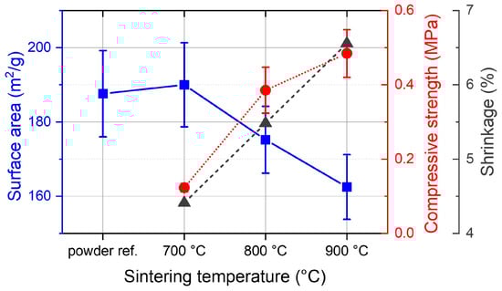 BET surface area (left axis, blue squares), compressive strength (right axis, red circles) and shrinkage (right axis, black triangles) of fumed silica powder and 3D-printed parts sintered at different temperatures.