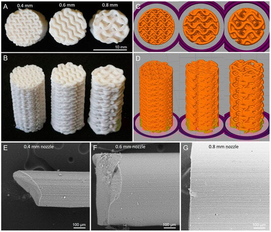 (A,B) Sintered gyroid cylinders printed with different nozzle sizes. (C,D) Corresponding slicing patterns. (E–G) Sintered filament pieces with different diameters.
