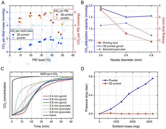 (A) CO2 adsorption capacity versus PEI load at 25 °C with 5000 ppm CO2. CO2 capacity per total sorbent mass (substrate + PEI) (left axis, blue) of 3D-printed (square) and powder samples (star). CO2 capacity per PEI mass (right axis, red). All samples were printed with a 0.4 mm nozzle. (B) CO2 adsorption capacity (left axis, blue) for 3D-printed monoliths (squares, solid line) and extruded granules (circles, dotted line) from different nozzle sizes. Printing time for one cylinder of 20 mm height and 10 mm diameter with different nozzle sizes (right axis, red). (C) CO2 adsorption (5000 ppm of CO2 in Ar) on different adsorbents at 25 °C with time. (D) Pressure drop across the sorption reactor versus sorbent mass for 3D-printed silica monoliths (red) and silica powder (blue) with a flowrate of 200 mL/min.