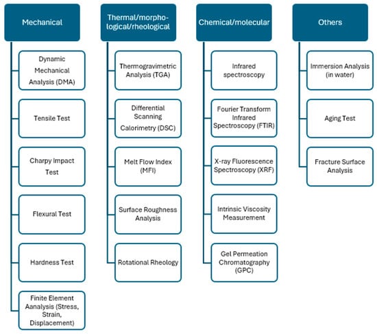 Fused filament fabrication (FFF) and FDM processes are the most used 3D printing processes in recycling polymers. Figure 2 summarizes the five-step recycling strategy commonly proposed in the literature. It comprises sorting/selection, cleaning/washing, drying, mixing/melting, extrusion/injection molding, and printing process. The sorting process involves separating different types of polymers from the waste stream. Once sorted, the polymers need to be cleaned to remove contaminants followed by thorough drying to remove any moisture. The drying process may include air drying, hot air drying, or vacuum drying. Next, the mixing/melting process generally involves shredding or granulating polymers into smaller pieces to increase surface area which facilitates melting. During the melting process, virgin or reinforced materials can be added. The molten polymers or composites are then shaped into pellets, filaments, or flake shapes through extrusion/injection molding. Recycled polymer filaments or pellets obtained from the extrusion/injection molding process can be then used as feedstock for 3D printers. The addition of virgin or reinforcing materials is also carried out to improve efficiency. Regarding the methodology used for analyzing the performance of recycling polymers, Figure 3 displays an overview of the most relevant testing procedures and measurement methods found in the literature. For the sake of readability, this information is organized into mechanical testing, thermal/morphological/rheological characterization, chemical/molecular measurement, and other analyses.