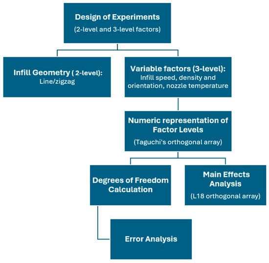 Gebrehiwot et al. [27] studied the effect of infill strategy on the mechanical performance of additively manufactured parts printed through FFF using Reform rPLA supplied by Formfutura. The research aimed to optimize the FFF process parameters by using Taguchi’s method and grey relational analysis. Taguchi’s method, implemented in a single-response approach, indicated that infill orientation and density were the most influential factors in achieving optimum tensile strength while specific combinations of infill geometry, infill density, infill orientation, nozzle temperature, and infill speed influenced the modulus of toughness. Infill orientation and nozzle temperature were highlighted as particularly significant factors affecting the modulus of toughness, while infill density had a lower impact. Grey relational analysis, a multiple-response approach, confirmed the findings of single-response optimization and identified specific parameter levels for achieving optimum responses. Infill orientation was found to be the most influential factor, followed by infill density and nozzle temperature. Based on the above-described optimization procedure, predictive models for tensile strength and modulus of toughness were successfully developed. The study also provided insights into the failure mechanisms associated with the different infill orientations. The practical implications of these findings are significant for optimizing the FFF process as well as achieving the desired mechanical properties in recycled PLA. Figure 4 presents an overview of the design of experiments (DoE), in a step-by-step guide, while Figure 5 shows the application of Taguchi’s DoE proposed in the study carried out by Gebrehiwot et al. [27].