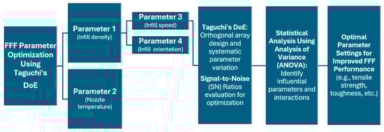 Flow of FFF parameters for the application of Taguchi’s method, systematic parameter variation, statistical analysis, and identification of optimal parameter setting for improved FFF performance [27].
