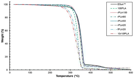 Agbakoba et al. [46] evaluated the thermomechanical properties of different recycled PLA materials, including those derived from failed 3D-printed components and waste biocomposite filaments. The main features of the tested polymers are summarized in Table 4. The thermogravimetric analysis, displayed in Figure 6, shows that a slight decrease in thermal stability for 100% virgin recycled PLA compared to ESun filament can be observed. In addition, recycled PLA-based filaments with varying blends (e.g., 80% recycled PLA + 20% virgin PLA, 50% recycled PLA + 50% virgin PLA, and 20% recycled PLA + 80% virgin PLA) exhibited improved thermal stability over those without addition (e.g., 100% virgin PLA, and 100% virgin recycled PLA). This confirms the existing literature, suggesting that the addition of pure PLA to recycled variants improves thermal stability.