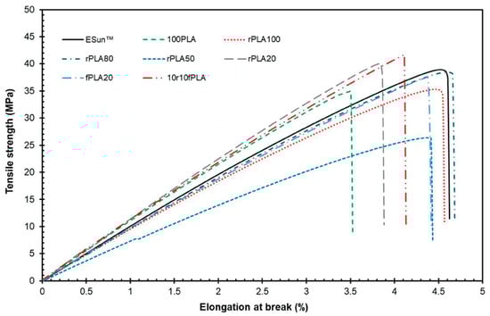 Regarding the monotonic tensile behavior of 3D-printed specimens through FFF (see Figure 7), ESun filaments exhibited the highest ultimate tensile strength (UTS) and maximum force at break (MFb), followed by variations in UTS and MFb for different recycled and virgin PLA filaments. The tensile modulus (TMod) indicated increased stiffness in recycled PLA100 compared to ESun, correlating with higher crystallinity. Moreover, elongation at break (Eb) varied among specimens, with binary blends of recycled and virgin PLA showing improved tensile deformation which was attributed to plasticizers. Fracture behavior analysis indicated brittle fracture for all samples, and DMA revealed a higher initial storage modulus for recycled filament (rPLA100) due to increased crystallinity. Visible permanent deformation was observed for ESun and rPLA100 at the end of the DMA analysis. Agbakoba et al. [46] highlighted the suitability of these recycled PLA materials for 3D printing applications based on their thermal and mechanical properties.