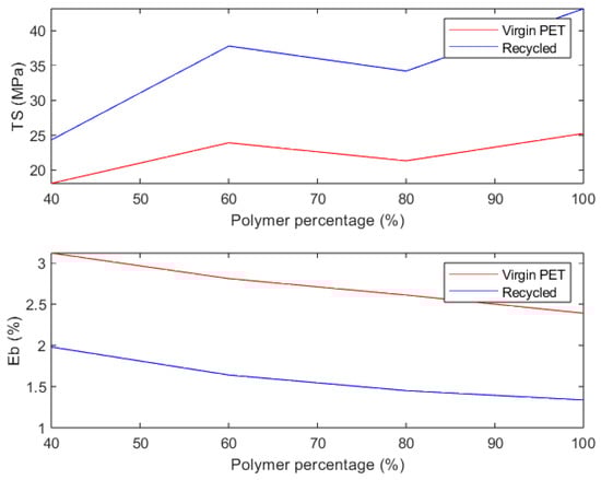 TS and Eb of virgin and recycled 3D printed PET. Data taken from reference [50] with permission by MDPI (CC BY).
