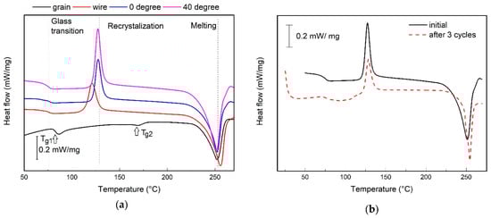 Another study by Pricop et al. [51] on recycled PET (see Figure 9) showed a 20% decrease in crystallization degree after three recovery cycles, compared to the initial cycle. In addition, it showed how recycled PET grain, filament, and printed specimens at 0° and 40° can exhibit variations in glass transition, recrystallization, and melting temperature during the first recycling cycle.