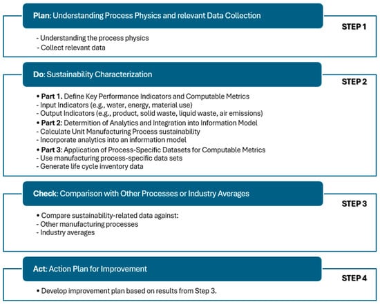 Mani et al. [64] proposed the sustainability characterization methodology summarized in Figure 10. The main steps, as displayed in the figure, comprise plan, do, check, and act. The planning step involves understanding the physics of the AM process (e.g., energy sources, melting and solidification, etc.) and collecting relevant information accordingly. In the second step, defining the key performance indicators and the analytics before applying the process-specific datasets is primordial. The next step encompasses checking the data obtained from the sustainable characterization and comparing them with other processes. The last step includes the action plan for improvement. The authors presented compiled ASTM standards related to AM. Additive manufacturing technology standards established by ASTM Committee F42 [65] play a crucial role in advancing the AM industry. These standards are instrumental in promoting knowledge dissemination, stimulating research efforts, and facilitating technology implementation within the AM sector. The standards address several topics, including terminology, production process performance, end-product quality, and machine calibration. They are continuously refined by technical subcommittees within ASTM Committee F42, and the National Institute of Standards and Technology (NIST) in the USA [66,67]. Moreover, the collaborative efforts between the ASTM F42 Committee and the ISO Technical Committee 261 hold new prospects for advancing recycling initiatives in AM, favoring a future more marked by sustainability [67,68]. An interesting discussion on the lack of standards governing quality assurance and quality control in AM can be found in the paper by Kietzmann et al. [69].