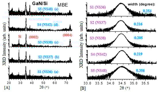 High resolution XRD measurements of five MBE-grown GaN/Si, (A) scans between 20–75 degrees of 2-theta and (B) w-GaN (0002) mode and their widths.