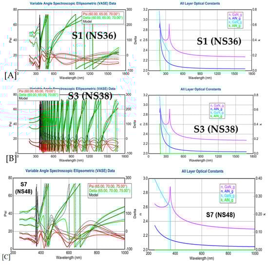 From the SE spectral simulation results, GaN film thicknesses and surface roughness (including the AlN buffer layer thicknesses) were obtained and they are listed in Table 3. From the deduced GaN n~λ curves, the sharp peaks indicated indeed the bandgap of GaN, which matched well the middle points of the steep drops from the GaN k~λ curves. These obtained Eg(GaN) values in units of both wavelength (nm) and energy (eV) are listed in Table 3. The seven GaN samples had a bandgap energy ranging from 3.415 eV to 3.419 eV with a difference within 0.004 eV. Similarly, the AlN buffer n~λ curves showed sharp peaks with the Eg(AlN) in the energy range of 6.274 eV to 6.284 eV. For sample S7, the experimental SE spectra were measured in a shorter range of 250–1000 nm, but these were quite good for the determination and analysis of the GaN energy gap and film information, although not for the AlN buffer gap value. From Figure 3D, the SE deduced α~λ relation is displayed for sample S3 in the near Eg(GaN) range of 300–550 nm. Indeed, all other six samples had similar α~λ curves to S3 because of their Eg values being ± 0.004 eV, i.e., with ~0.1% error bars.