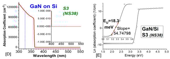 Figure 3E shows the lnα~eV curve with a steep slope region, the inverse of which gives the Urbach energy Eu of GaN on Si. This is like the case of BaTiO3 for the determination of EU [33]. It is interesting that all seven GaN films on Si possessed the same Eu value, as shown in Figure 3E, indicating that this set of MBE-grown GaN/Si possessed similar film quality even though they had a wide range of film thicknesses which varied between 160 nm and 1500 nm.
