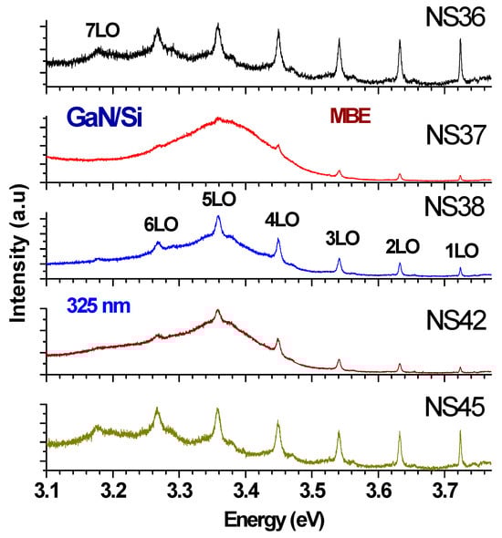 Figure 5 shows the RT combined PL–Raman spectra under UV (325 nm) excitation measurements for five MBE GaN/Si samples. The three PAMBE GaN/Si samples S2, S3, and S4 (NS37, NS38 and NS42) attained their main PL peak at approximately 3.36 eV. The other two films had their PL band at a similar energy, although it appeared to be weak and overwhelmed by relatively strong LO peaks. Multiple LOs up to 7LO were enhanced because of their outgoing resonance with the Eg(GaN). The PL peaks of GaN/Si have been shown to be red-shifted compared with the PL peak value of 3.40–3.42 eV from MOCVD-grown GaN/sapphire [29]. This reflects the different hetero-mismatch situation in which the GaN layer on sapphire undergoes a compressive stress due to the sapphire lattice constant being larger than that of w-GaN, while GaN epitaxed on Si has a tensile stress from the reverse situation [34,35].