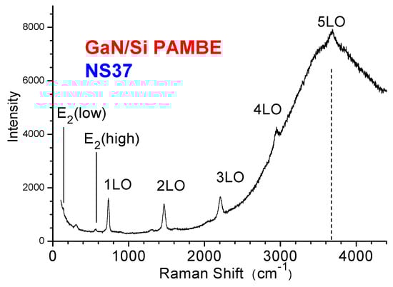 To demonstrate clearly the multiple LO phonon resonance with the fundamental GaN cross-band gap PL, Figure 6 presents a combined UV–Raman–PL spectrum of an MBE-grown GaN/Si, S2 (NS37), displayed in Raman shift. The broad band centered at approximately 3670 cm−1 Raman shifts corresponds to 3.36 eV and represents the emission from the GaN fundamental band edge. GaN Raman E2(high) and A1(LO) (labeled with 1LO in the figure) modes are observable. Also, because of the resonance with the GaN fundamental band gap of near 3.4 eV at RT, multiple sharp lines appeared superimposed on the top or on the higher energy side of the GaN fundamental recombination band of 3.36 eV, and they are noted as 1LO, 2LO, 3LO, 4LO and 5LO, with the interval of about 732 cm−1, i.e., 91 meV, which is the GaN LO phonon energy. This is analogous to the case of GaN on sapphire grown by MOCVD [36].