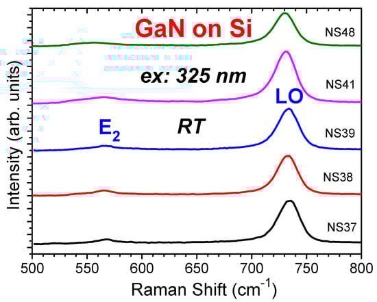 Figure 7 shows the UV (325 nm) excited Raman spectra of the GaN modes of E2, i.e., E2(high), and LO, i.e., A1(LO), for the samples NS37, NS38, NS39, NS41, and NS48, respectively. Our Raman scattering under an excitation of 325 nm and using a HR T64000 system showed the Raman features of the GaN films only, without the Si Raman 520 cm−1 peak, in comparison with the visible (532 nm) excitation Raman spectra in Figure 4. The GaN E2(high) phonon modes were very clearly displayed, unlike Figure 4, mixed with the Si 520 cm−1 mode.