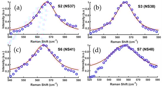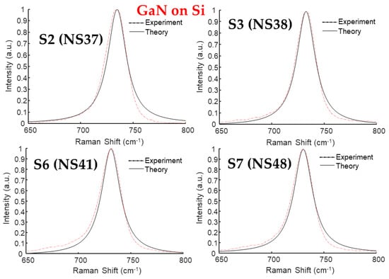 where e is the electron charge and m* is its effective mass. Figure 9 presents experimental Raman data and mode fits, based on Equations (8)–(12), on the A1(LO) modes of four GaN/Si samples.
