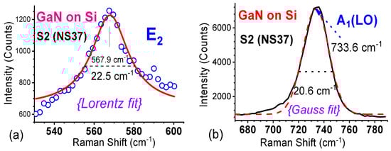 These Raman modes can also be simply fitted using the Lorentz and Gauss functions. Figure 10 shows experimental Raman data and (a) a Lorentz fit on the E2 mode and (b) a Gauss fit on the A1(LO), i.e., LO mode, of the GaN/Si sample S2 (NS37). The E2(high) phonon had a mode frequency of 567.9 cm−1, with FWHM equal to 22.5 cm−1. The best fit for A1(LO) was the gaussian function, with a peak frequency of 733.6 cm−1 and FWHM of 20.6 cm−1. These kinds of Lorentz and Gauss fits are suitable for quick characterizations and comparisons on grown materials, especially in the production environment.