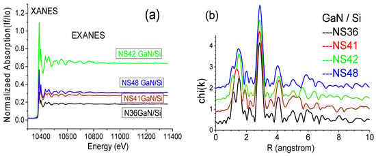 Figure 11a shows the Ga K-edge XAFS spectra of four GaN/Si samples. Two spectral regions are marked: X-ray absorption near edge structure (XANES) near Ga K-edge within about 30 keV, from which information about the local symmetry and various electronic transitions can be obtained [44], and the extended X-ray absorption near edge structure (EXANES), from which information about radial distance and coordination number of the absorbing atom can be deduced [44]. Figure 11b presents their Fourier transformation from k to R space of Ga K-edge EXANES. It is shown that the positions and shapes of the second peak at ~3 Å in the R space are almost the same for the four samples. This means that the Ga–Ga distance in the four GaN films had no difference. However, the Ga–N distance in these samples, ranked from the shortest to the longest, is NS41 < NS48 < NS42 < NS36.
