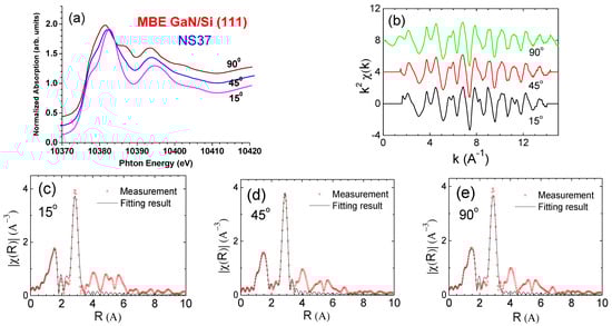 We performed a more penetrative XAFS investigation than that for a typical GaN/Si sample in the case of S2 (NS37). Figure 12a exhibits the angular-dependent NEXAFS spectra from the PA-MBE GaN/Si NS37 sample for three incidences of θ = 15°, 45°, and 90°, all determined from the normal direction of the sample surface. Figure 12b shows the spectral data converted from the energy scale to the k-space scale with a k2-weigthed multiplication. Subsequently, following Figure 12a,b, the Fourier transform of raw data and fitting were done by using the IFEFFIT program [41,44], with results shown in Figure 12c–e. The chi data, i.e., k2 χ (k) weighed spectra in Figure 12b, were Fourier transformed to the R-space data. Peaks in spectra in Figure 12c–e indicate reflective waves from the atoms around the absorbed (Ga) atom.