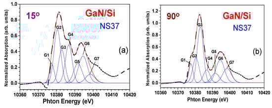 Also, further analyses on the NEXAFS data in Figure 12a revealed more characteristic features of the w-GaN film which are dependent on the incident angle. Specifically, these spectra were properly fitted with gaussian functions for the NEXAFS resonances and indexed as G1–G7 in Figure 13a,b, which show the angular dependence of the areas under the gaussian functions. The gaussian-function-fitted energy positions, FWHMs, and areas of the NEXAFS resonances from the GaN/Si sample (NS37) are listed in Table 6. Based on these analyses and observations, it was found that the energy positions E and the FWHM of NEXAFS resonances were independent of θ, confirming that this GaN film was purely hexagonal. This conclusion matches with the XRD characterization results.