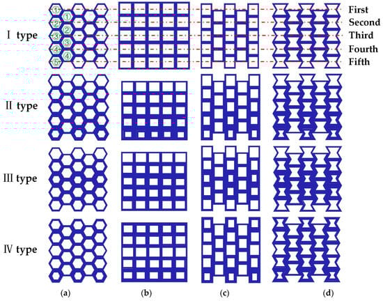 Figure 7. Four types of thickness gradient honeycomb structures: (a) hexagonal honeycomb; (b) square honeycomb; (c) quasi-square honeycomb; and (d) re-entrant hexagonal honeycomb.