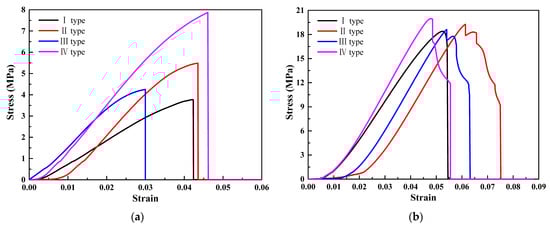 The stress–strain curves of four types of thickness gradient honeycomb structure specimens are shown in Figure 8. From Figure 8, it can be observed that the stress and strain of the square honeycomb structure specimen are the highest, while the stress and strain of the re-entrant hexagonal honeycomb are the lowest. The load-bearing capacity and structural deformation of the square honeycomb structure specimen are the highest. The slope of the stress–strain curve represents the elastic modulus of the specimens during the elastic stage. Therefore, it can be concluded that the elastic modulus of the square honeycomb structure specimen is the highest, while the elastic modulus of the re-entrant hexagonal honeycomb is the lowest. The area under the stress–strain curve is usually used to evaluate the fracture toughness of the specimens. Therefore, it is concluded that the fracture toughness of the quadrate honeycomb structure type II specimens is the largest. Due to the existence of the thickness gradient structure, the specimens will show uneven deformation behavior under load. The deformation of structural non-uniformity manifests as different slopes or shapes on the stress–strain curve. Therefore, it is concluded that the shape of the quasi-square honeycomb structure type IV specimens changes greatly compared with the other three structural types.