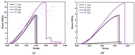 Figure 8. Stress–strain curves of four gradient honeycomb structures: (a) hexagonal honeycomb; (b) square honeycomb; (c) quasi-square honeycomb; and (d) re-entrant hexagonal honeycomb.