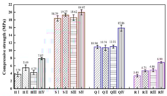 Compared to similar structures, the compression strength of the H IV type is 108.20% higher than that of the H I type, the compression strength of the S IV type is 8.59% higher than that of the S I type, the compression strength of the Q IV type is 44.97% higher than that of the Q I type, and the compression strength of the R IV type is 102.94% higher than that of R I type. In the same type of structure, the thickness of the cellular wall in the structure has a positive impact on the compressive strength of the structure. The greater the thickness of the cellular wall, the greater the overall stiffness of the structure. Therefore, the specimens with the same cellular wall thickness has the lowest compressive strength among the four structures.
