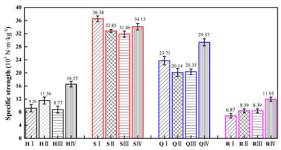 Figure 10 shows the specific strength of different types of specimens of the four structures. It can be observed from Figure 10 that the specific strength of the square honeycomb structure is the largest, followed by the quasi-square honeycomb structure, and the re-entrant honeycomb structure is the smallest. This result is consistent with the research findings of Nath et al. [42]. A high specific strength means that, under the same volume, this type of structure can withstand a greater load, and has better bearing capacity and anti-failure performance. Compared to similar structures, the specific strength of the H IV type is 79.89% higher than that of the H I type, the specific strength of the Q IV type is 23.87% higher than that of the Q I type, and the specific strength of the R IV type is 73.65% higher than that of the R I type.