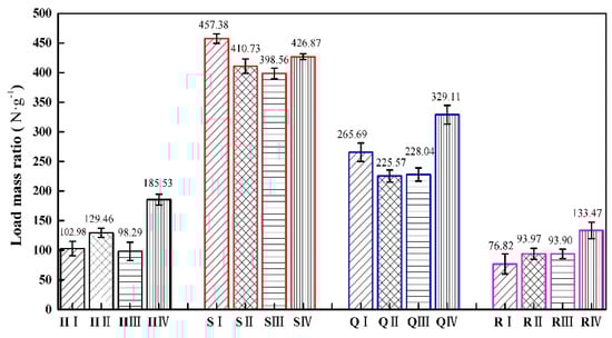 Figure 11 shows the load−mass ratio of different types of specimens in four structures. The load−mass ratio reflects the balance between the mass and performance of the structure under load. The lighter structure has a higher load−mass ratio under the same load. In this regard, the square and quasi-square thickness gradient honeycomb structures with square cells have obvious advantages, because they can achieve a lighter weight while ensuring a certain performance. It can be observed from Figure 11 that the load−mass ratio of the square honeycomb structure is the largest, followed by the quasi-square honeycomb structure, and the re-entrant honeycomb structure is the smallest. In the square thickness gradient honeycomb structure, the load–mass ratio of the cell arrangement structure with an equal wall thickness is the highest. Compared to similar structures, the load−mass ratio of the H IV type is 80.16% higher than that of the H I type, the load−mass ratio of the Q IV type is 23.87% higher than that of the Q I type, and the load−mass ratio of the R IV type is 73.47% higher than that of the R I type.