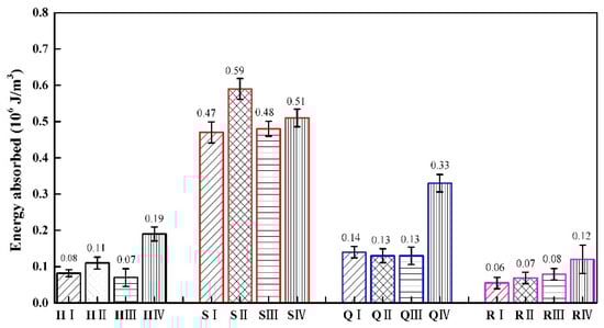Figure 12 shows the energy absorption of different types of specimens in the four structures. It can be observed from Figure 12 that the square honeycomb structure has the largest energy absorption, followed by the quasi-square honeycomb structure, and the re-entrant honeycomb structure has the smallest energy absorption. In a square thickness gradient honeycomb structure, the S II type structure has the highest energy absorption. Among the four thickness gradient honeycomb structures, the type IV structure has good energy absorption. This result is consistent with the research findings of Shu Cai Xu et al. [43]. Compared to similar structures, the energy absorption of the H IV type is 137.5% higher than that of the H I type, the energy absorption of the S IV type is 8.51% higher than that of the S I type, the energy absorption of the Q IV type is 135.71% higher than that of the Q I type, and the energy absorption of the R IV type is 100%higher than that of the R I type.