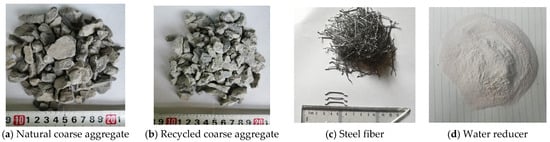 The experiment utilized PO.42.5R Portland cement from the “Hailuo” brand. The fine aggregate consisted of river sand with a fineness modulus of 2.38. Natural coarse aggregate consisted of granite crushed stone ranging in size from 5 mm to 25 mm. The recycled coarse aggregate was derived from laboratory waste blocks (C30), crushed, and sieved to match the particle size of the natural aggregate. After testing based on the Chinese Standard JGJ 52-2006 [20], the water absorption rate of the natural aggregate was 0.48%, with a crushing index of 7.71%. The recycled coarse aggregate exhibited a water absorption rate of 3.56%, along with a crushing index of 14.7%.
