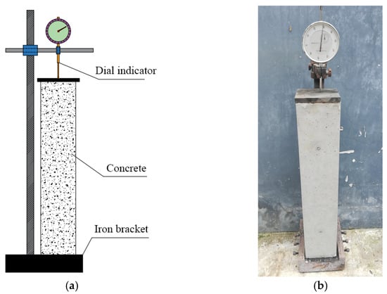 The shrinkage specimens were first cured with molds for one day and then placed on the shrinkage measurement instrument illustrated in Figure 3 after demolding. The measurement of concrete shrinkage was conducted using a shrinkage comparator of model BC-160, produced by China’s Beijing Zhongke Lanjian Instrument Equipment Co., Ltd. (Beijing, China). Test procedures are as follows [22]. First, the entire structure was positioned in a cool, windless indoor place, and the initial length was recorded. Subsequently, the lengths of each specimen were measured at 1 d, 3 d, 7 d, 14 d, and 28 d intervals. By subtracting the corresponding age length from the initial length, the shrinkage value of each specimen was determined. During the testing period, the local city experienced an average temperature ranging from 17 °C to 26 °C, with an average relative humidity of 63%.