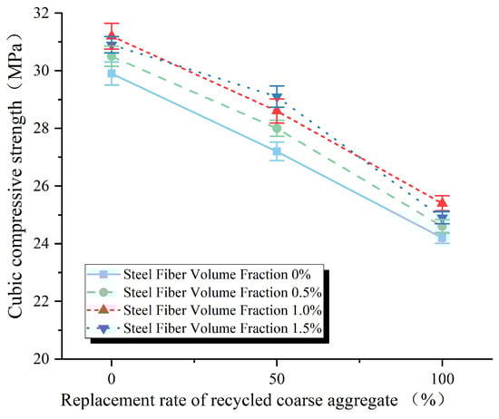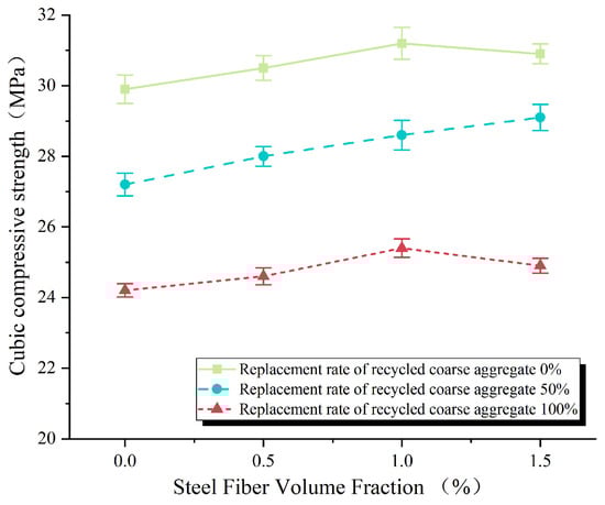As depicted in Figure 5, when the replacement rate of recycled coarse aggregates reaches 50%, the compressive strength of recycled concrete exhibits an increasing trend alongside the volumetric dosage of steel fibers. The maximum improvement of 6.98% is attained at a steel fiber dosage of 1.5%. Conversely, in cases where the replacement rate of recycled coarse aggregates is 0% or 100%, the compressive strength of recycled concrete initially rises, then declines as the volumetric dosage of steel fibers increases. The peak enhancements achieved are 4.35% and 4.96%, respectively, at a steel fiber dosage of 1.0%.