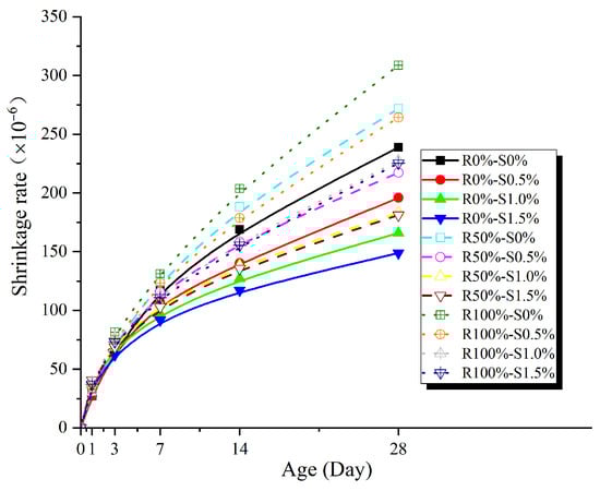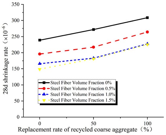 As shown in Figure 6, the 28-day shrinkage increases with replacement rates of recycled coarse aggregates increase. Statistical analysis reveals that, compared to concrete without any recycled coarse aggregates, the average 28-day shrinkage increases by 13.86% and 36.85% for concrete with 50% and 100% replacement, respectively. This indicates that the addition of recycled coarse aggregates results in a deterioration of concrete’s shrinkage performance, with a greater degree of deterioration at higher replacement rates.