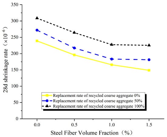 As shown in Figure 7, the 28-day shrinkage of concrete is observed to decrease with an increase in the volume fraction of steel fibers. However, when the volume fraction of steel fibers exceeds 1.0% and reaches 1.5%, the 28-day shrinkage rate of concrete shows only a slight reduction or remains relatively stable. This suggests that steel fibers can effectively inhibit concrete shrinkage. However, as the volume fraction of steel fibers increases beyond a certain threshold, their inhibitory effect starts to decline, which is consistent with the findings in the references [15,29,30]. This is attributed to the fact that the presence of uniformly distributed steel fibers forms a complex three-dimensional network within the concrete, effectively inhibiting aggregate settling, enhancing concrete uniformity, and reducing inherent defects. Furthermore, it acts as a barrier to prevent moisture overflow and minimize moisture loss. However, excessive steel fibers complicate the compaction process, leading to increased porosity and an uneven distribution of fibers, thereby weakening their ability to control shrinkage.