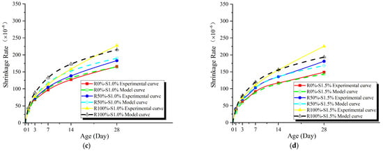 According to Figure 8, the shrinkage rate of all specimens increases with age. However, the rate of increase gradually slows down as the specimens age. During the initial stages, the shrinkage rate exhibits a rapid increase. Furthermore, the specimens with different replacement ratios of recycled coarse aggregates and volume fractions of steel fibers show minor variations in shrinkage rate. This can be attributed to the higher relative humidity within the concrete during this period, which facilitates cement hydration reactions, with chemical shrinkage playing a predominant role. In the later stages, the shrinkage rate of the specimens decreases due to the limited unhydrated cement or the loss of free water, hindering further cement hydration and resulting in a weakening of chemical shrinkage. Additionally, drying shrinkage is closely linked to the internal relative humidity of the concrete. As the internal relative humidity gradually decreases, the rate of drying shrinkage slows down.