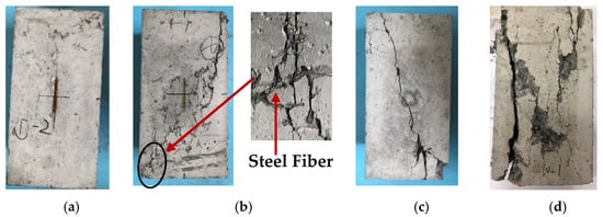 The damaged forms of some specimens are shown in Figure 10. It is observed that the failure patterns of steel fiber-reinforced recycled aggregate concrete are influenced by the replacement ratio of fine aggregates and the volume fraction of steel fibers. The specimens without steel fibers mainly exhibited splitting failure with straight cracks, and the failure surfaces were mostly parallel to the direction of the applied force, resulting in local crushing or spalling of the concrete. After adding steel fibers, the specimens showed shear-type failure, with the failure plane forming an angle with the load axis. Diagonal cracks extended outward with numerous fine cracks. Upon close inspection, steel fibers could be seen at the crack locations. Due to the bridging effect of the steel fibers across the failure surfaces, the cracks were shallower and narrower, maintaining the good integrity of the concrete. Furthermore, a higher replacement ratio of fine aggregates leads to more pronounced crack development. This can be attributed to the fractures occurring primarily at the interfaces between the aggregates and the mortar. Since recycled fine aggregates possess abundant sharp edges, the interface between the new and old cement mortars becomes weaker, resulting in greater levels of interface crack propagation.