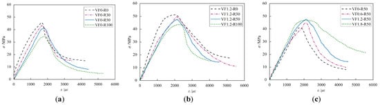 The influence of each parameter on the stress-strain curve: (a) Replacement rate of recycled fine aggregate (ordinary concrete); (b) Replacement rate of recycled fine aggregate (steel fiber concrete); (c) Volume fraction of steel fibers.