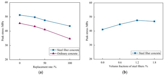 The influence of each parameter on peak stress: (a) Replacement rate of recycled fine aggregate; (b) Volume fractions of steel fibers.