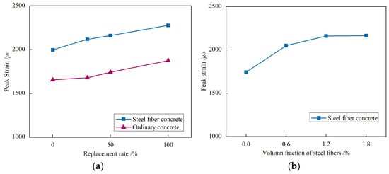 The influence of each parameter on peak strain: (a) Replacement rate of recycled fine aggregate; (b) Volume fractions of steel fibers.