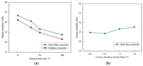 Influence of different parameters on the elastic modulus of steel fiber-recycled fine aggregate concrete: (a) Replacement rates of recycled fine aggregate; (b) Volume fractions of steel fibers.