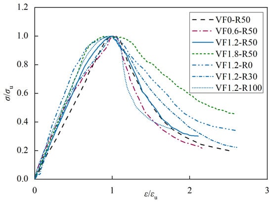 The stress-strain curves of concrete obtained under different replacement ratios and fiber contents in this experiment are normalized for ease of analysis. The x-axis represents ε/εu (normalized strain), and the y-axis represents σ/σu (normalized stress), where σu and εu are the peak stress and strain of the specimens, respectively. Figure 15 illustrates the normalized stress-strain curves for each group. The curves of the steel fiber-reinforced recycled aggregate concrete shown in Figure 15 share a similar shape with those of ordinary concrete. Referring to relevant literature on recycled aggregate concrete and steel fiber-reinforced concrete, the following equations can be employed for initial fitting purposes [33,34]: